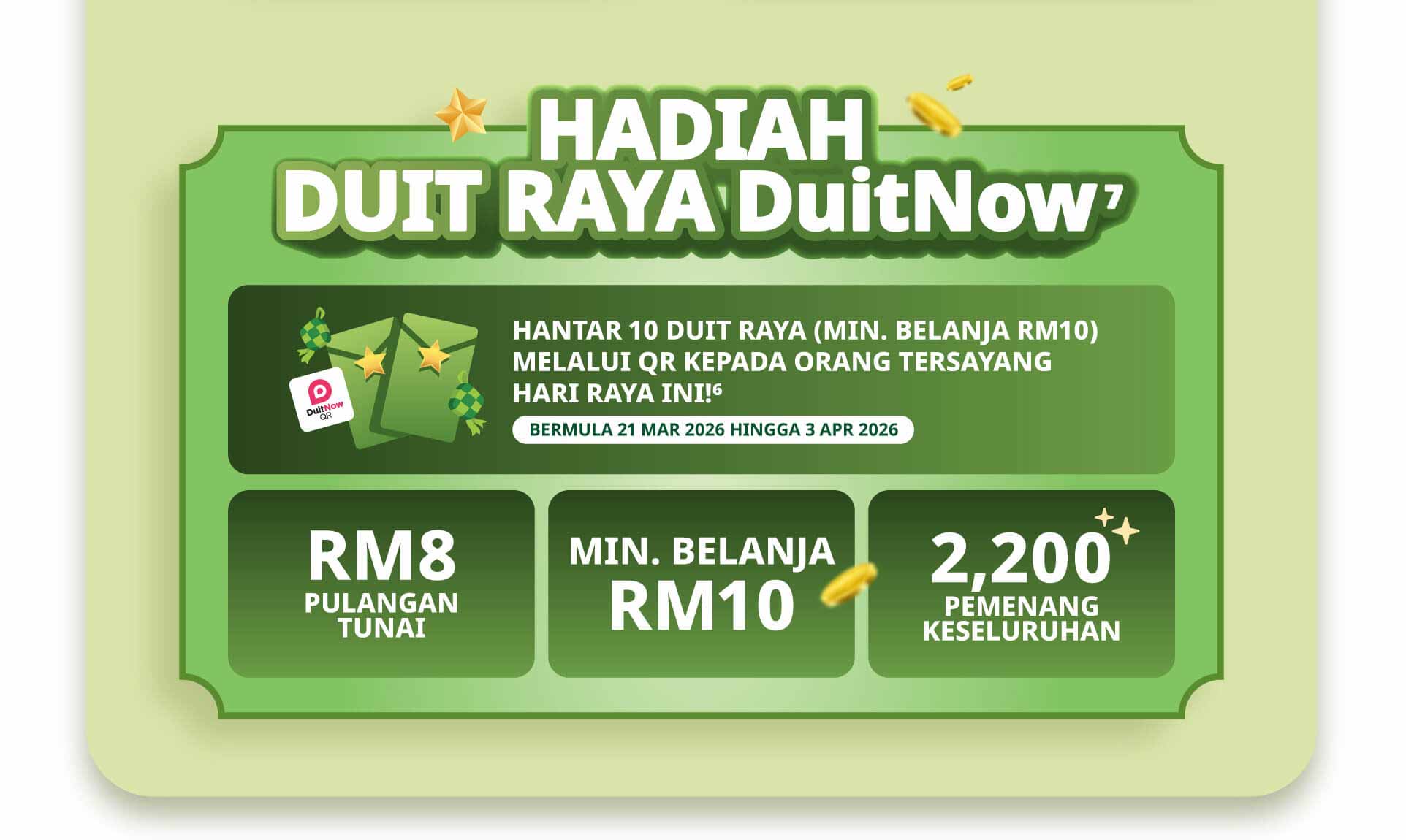 3. Setiap pelanggan boleh memenangi maksimum satu (1) Hadiah Utama atau satu (1) Hadiah Saguhati serta satu (1) Hadiah Pengguna Baharu QR, pulangan tunai sehingga RM30 bagi Hadiah QR 7 Hari Berturut-turut dan satu (1) Hadiah Duit Raya DuitNow sepanjang Tempoh Kempen.