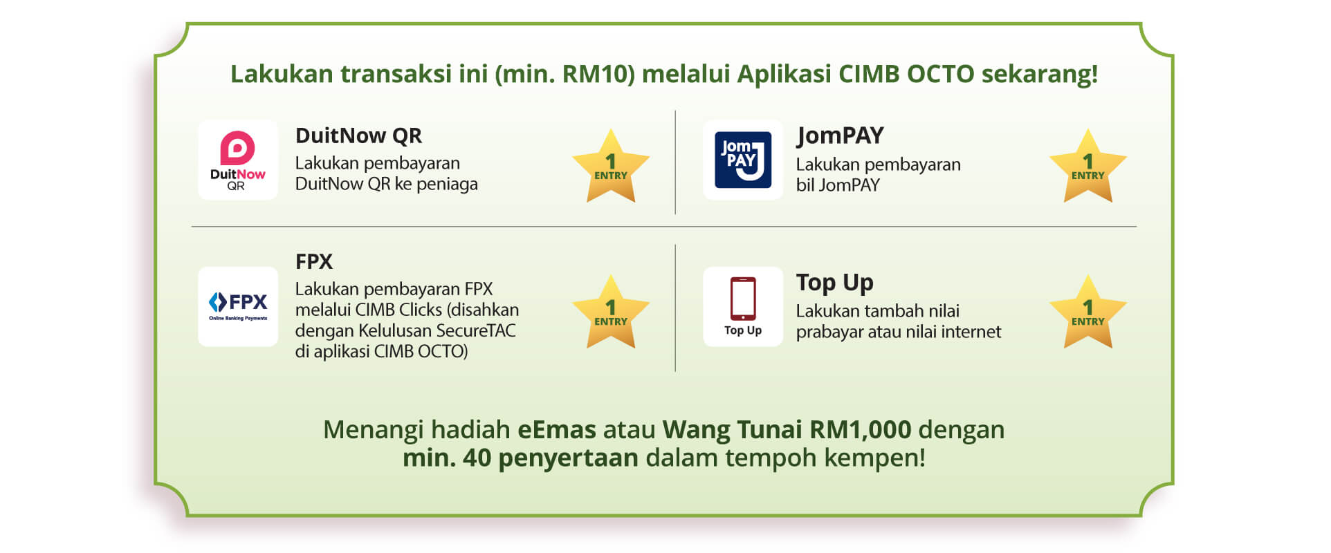 1. Transaksi layak merujuk kepada transaksi berjaya dengan nilai minimum RM10 melalui Aplikasi CIMB OCTO bagi DuitNow QR (bayar kepada peniaga), DuitNow QR (rakan ke rakan), JomPAY, Tambah Nilai, atau FPX (kelulusan SecureTAC pada Aplikasi CIMB OCTO) sepanjang Tempoh Kempen.