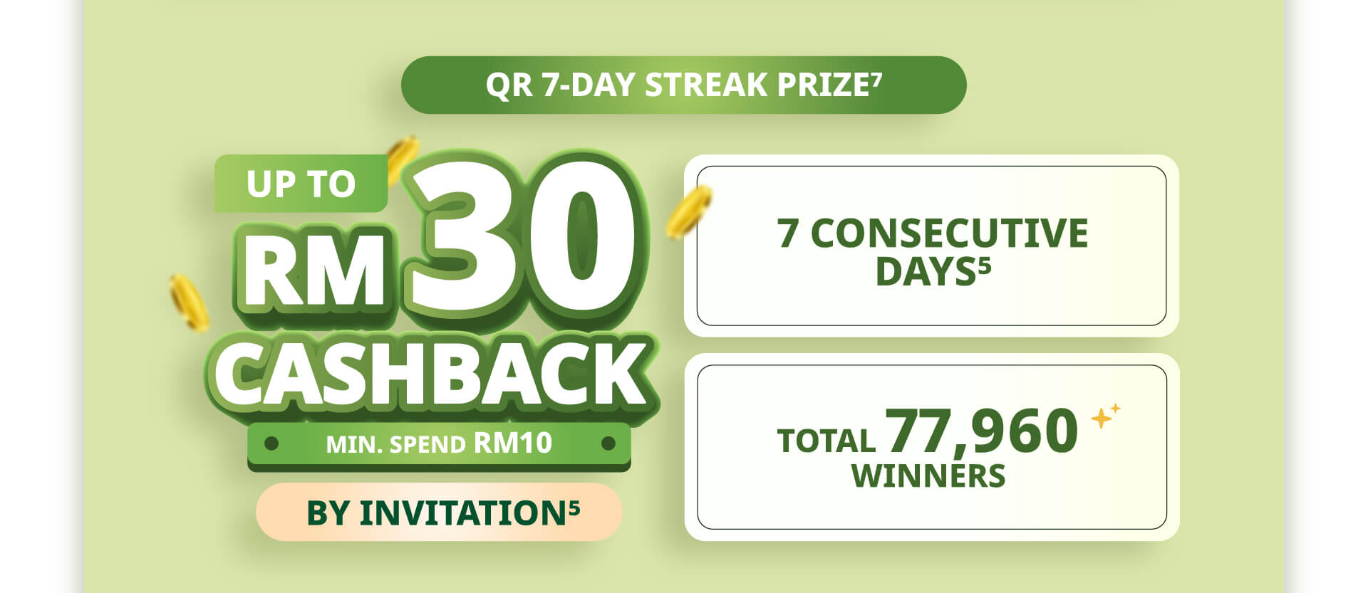 3. Each customer can win a maximum of one (1) Grand Prize or one (1) Consolation Prize as well as one (1) QR New User Reward, up to RM30 cashback of QR 7-day Streak Prize and one (1) DuitNow Duit Raya Reward during the Campaign Period