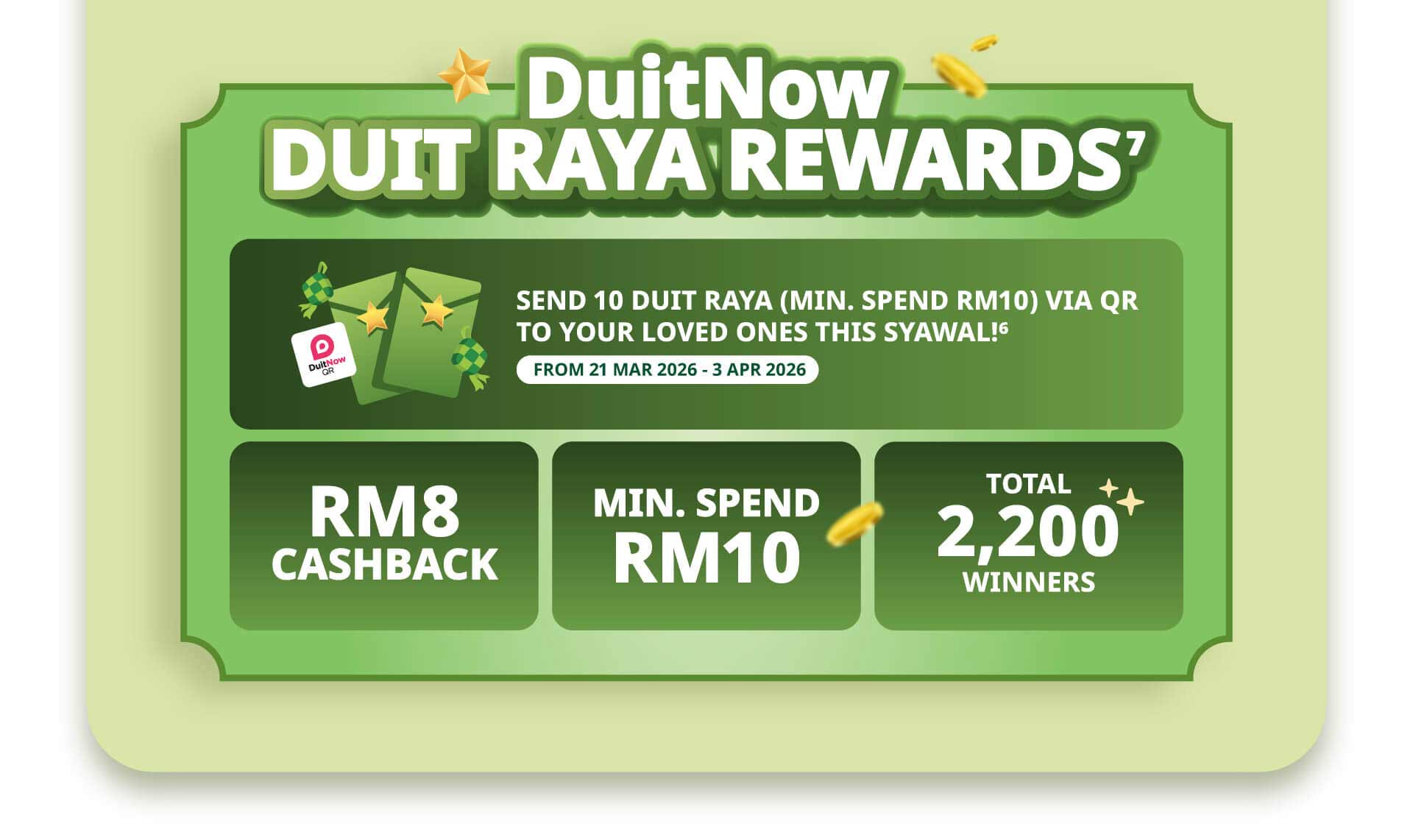 6. To qualify for the DuitNow Duit Raya Reward, customers must perform ten (10) DuitNow QR Peer-to-peer transactions per week over the course of first two weeks of Hari Raya within the campaign period.