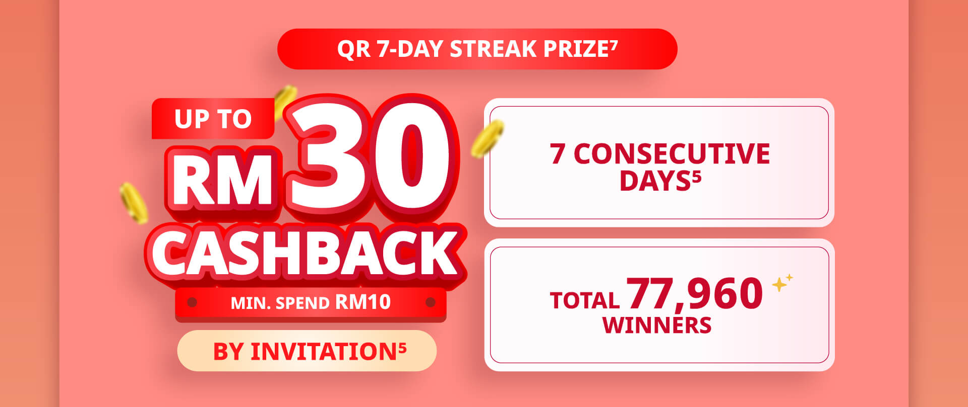 3. 3. Each customer can win a maximum of one (1) Grand Prize or one (1) Consolation Prize as well as one (1) QR New User Reward, up to RM30 cashback of QR 7-day Streak Prize and one (1) DuitNow Angpau Reward during the Campaign Period